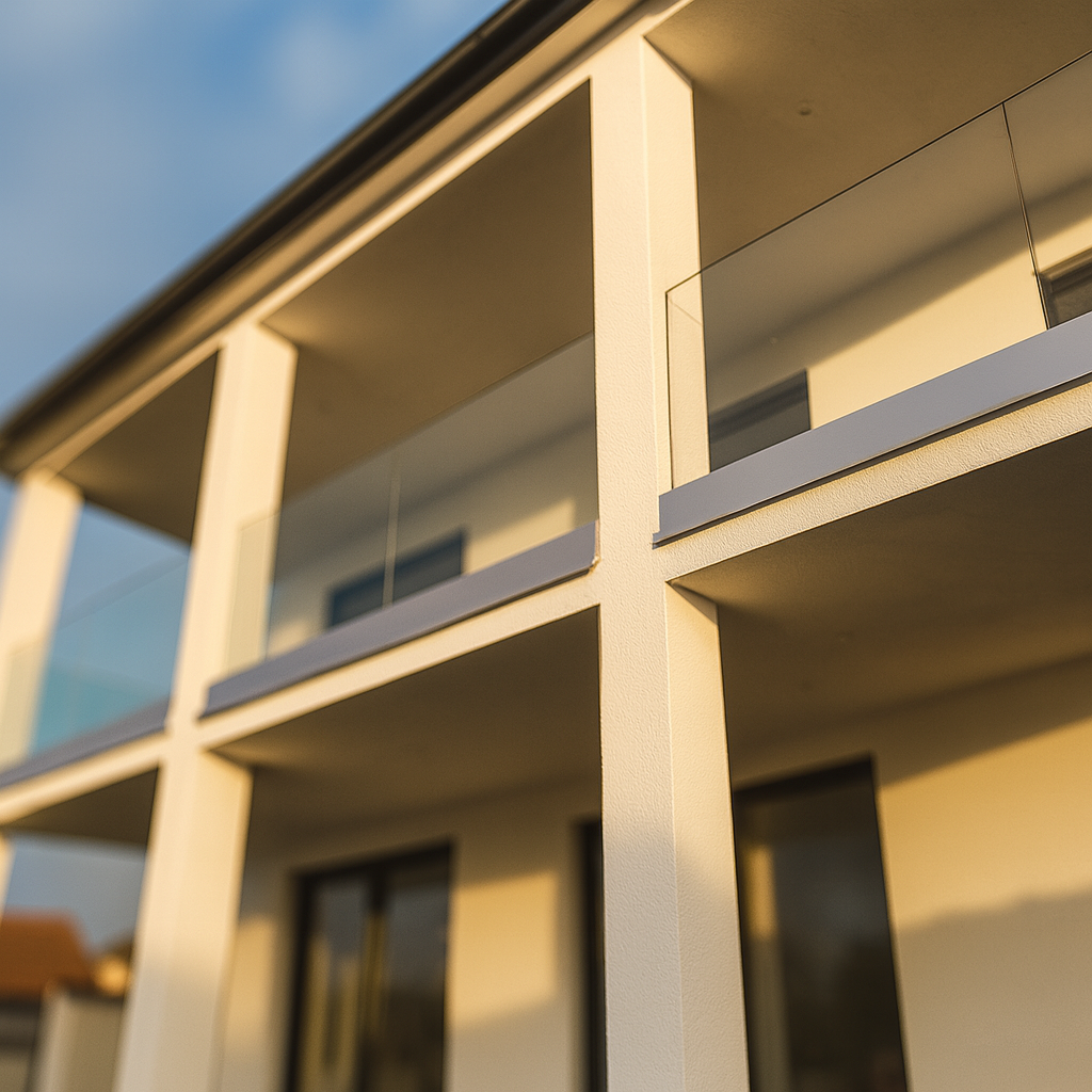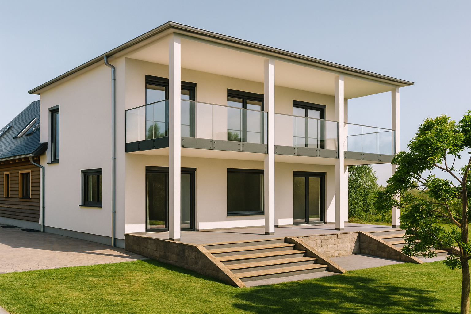 Im Obergeschoss erstreckt sich ein rund 3 m tiefer Balkon über die gesamte Breite des Hauses. Von hier öffnet sich der Blick auf den sonnigen, südseitigen Garten. Das elegante Nurglasgeländer und die schlanken Stützen verleihen dem Balkon Leichtigkeit und Transparenz.